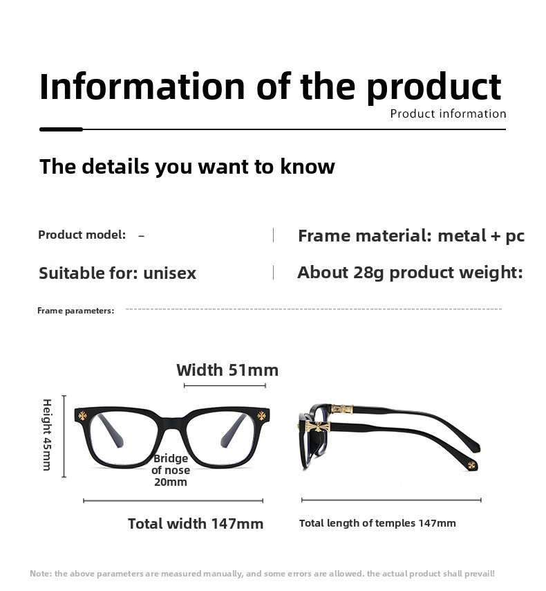 Frame colors: Black frame gold, black frame silver, transparent gold, transparent silver, bean curd gold, milk silver, transparent gray silver